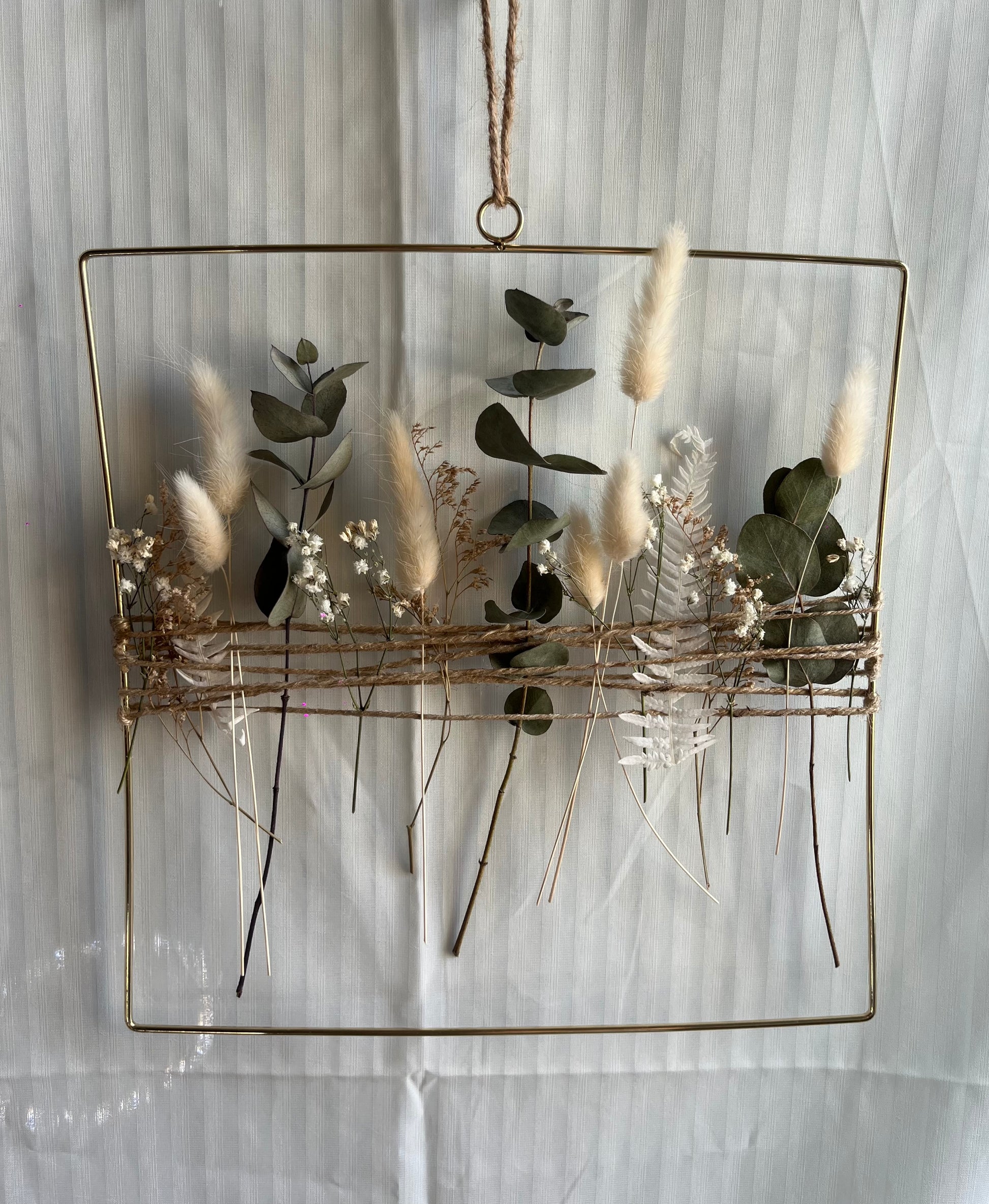 Suspension murale de fleurs séchées réalisée à la main. Délicate, naturelle et durable, elle sublime un mur, une porte ou un intérieur avec une touche bohème et chaleureuse.