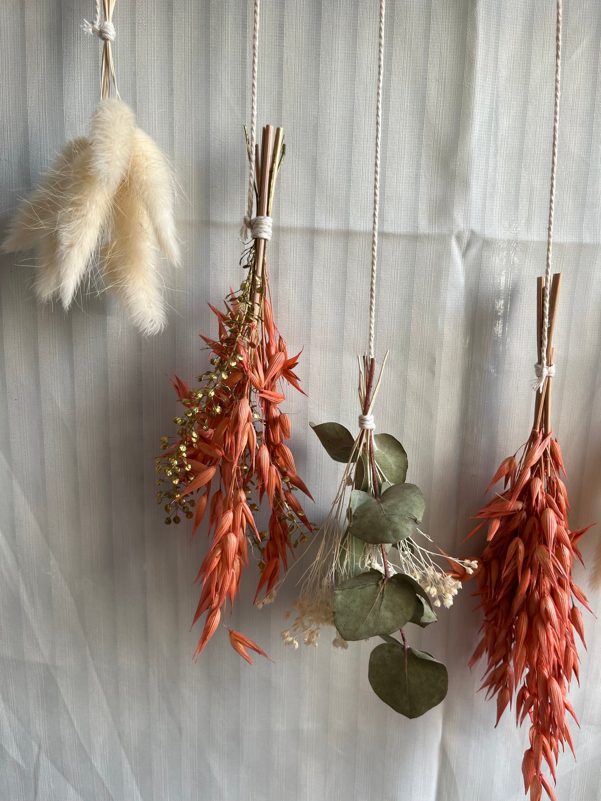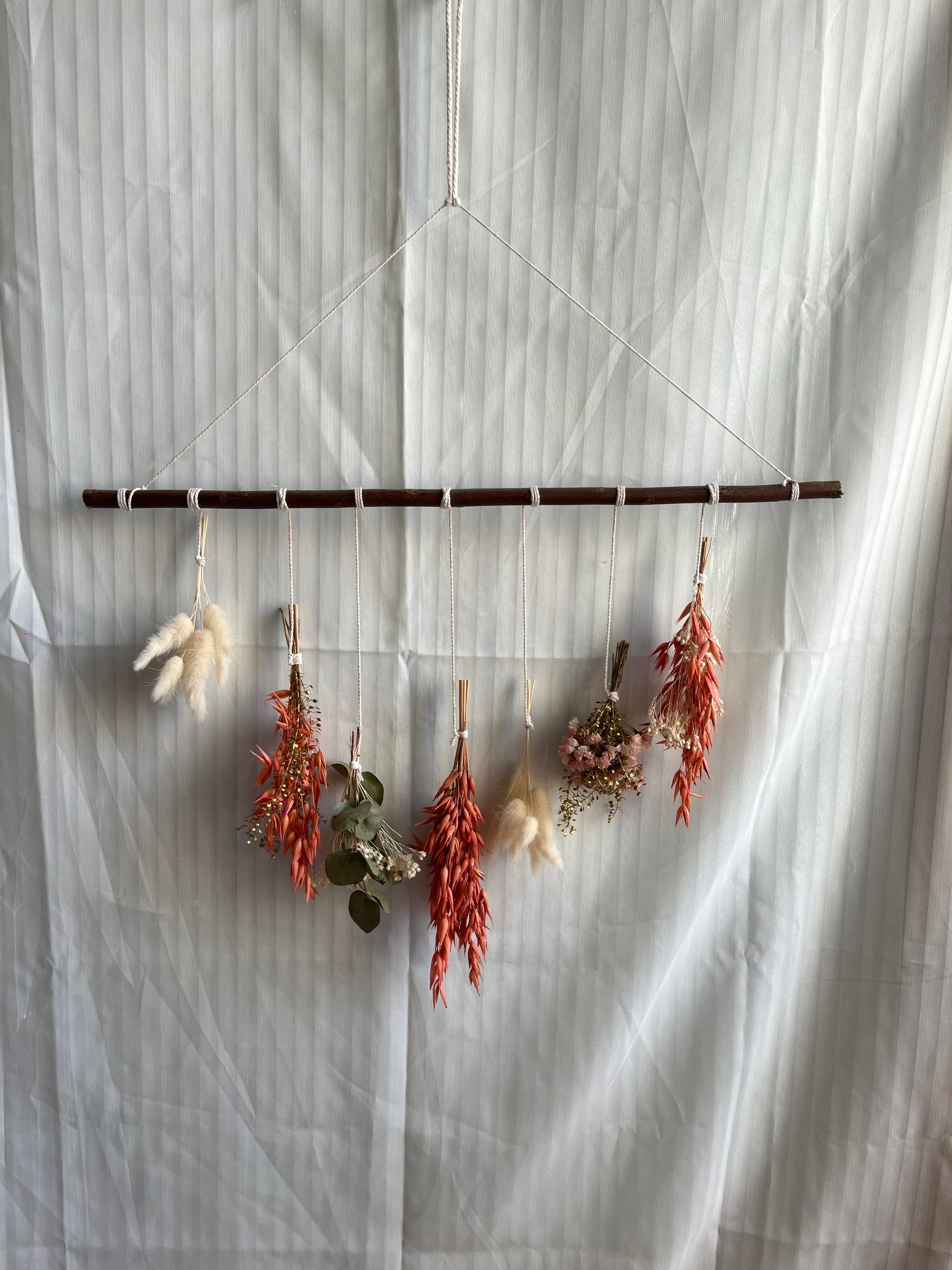 Suspension murale de fleurs séchées réalisée à la main. Délicate, naturelle et durable, elle sublime un mur, une porte ou un intérieur avec une touche bohème et chaleureuse.
