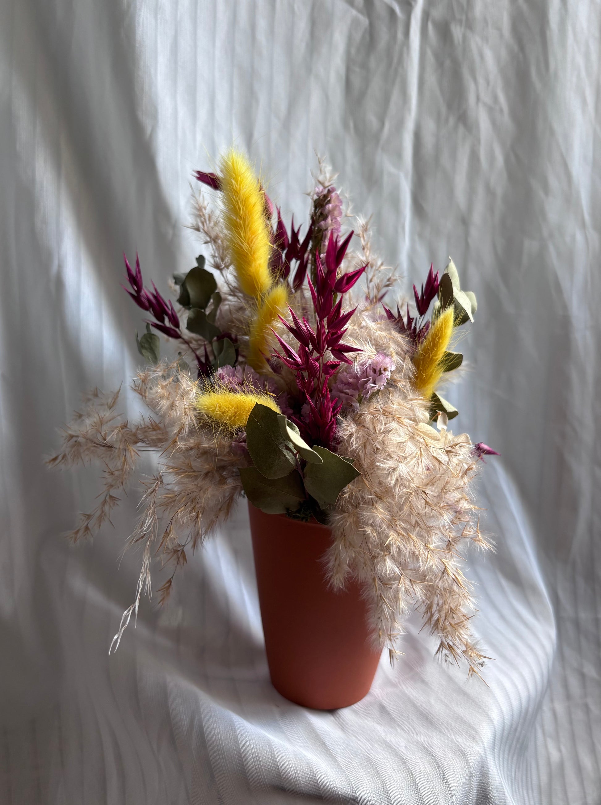 Composition florale piquée en fleurs séchées, réalisée à la main dans mon atelier, dans un pot en terre cuite de qualité. Chaque fleur est soigneusement sélectionnée puis piquée dans une mousse florale pour offrir une création stable, durable et élégante. Poétique et intemporelle, elle apportera une touche naturelle et délicate à votre intérieur.