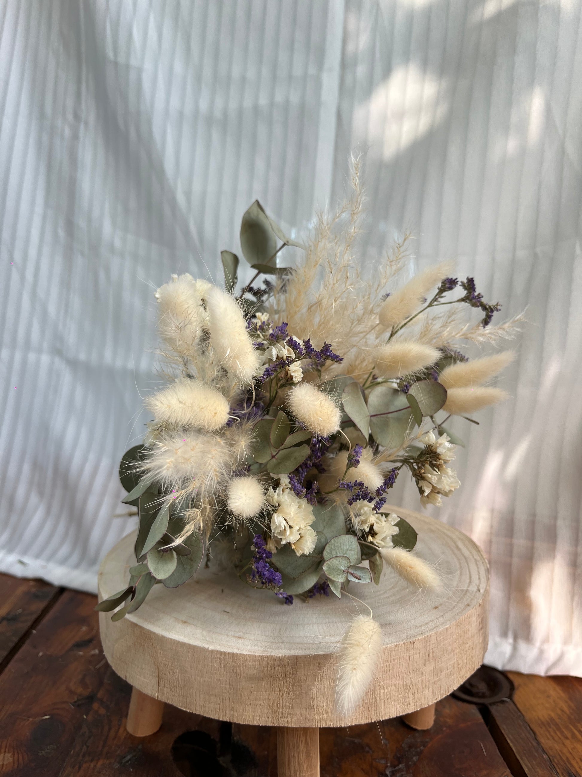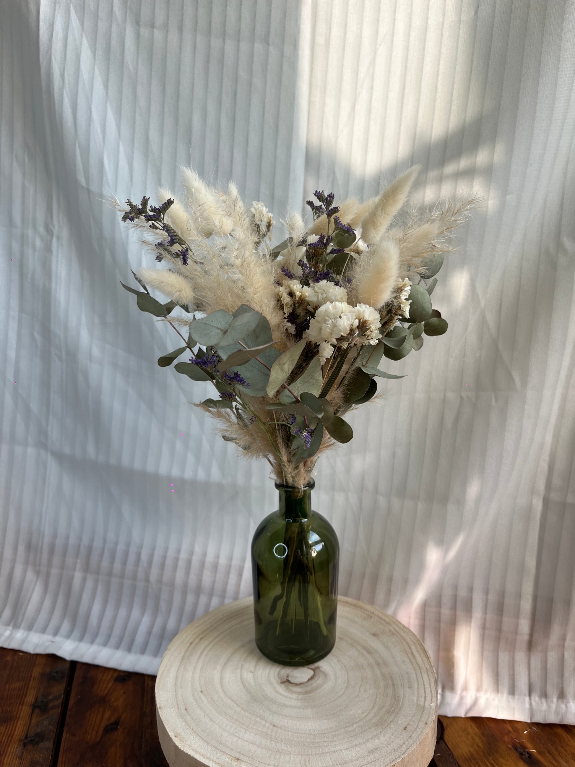 Petit bouquet de fleurs séchées, composé à la main dans mon atelier, et présenté dans un joli vase en verre marron ou vert. Chaque création est unique, réalisée avec des fleurs naturelles soigneusement sélectionnées pour leur texture, leur teinte et leur tenue dans le temps.
